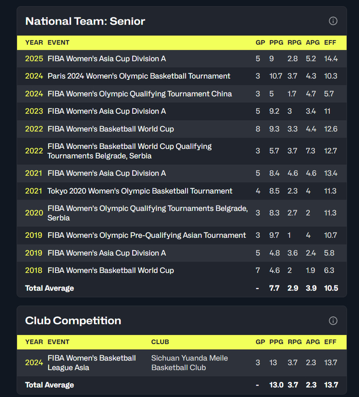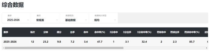 本赛季31岁的老将王思雨代表四川女篮出战12场比赛,场均23.2分钟,拿到9.8分6.2助攻3.3篮板1.5抢断0.4盖帽,命中率47.4%,三分命中率32.2%,她在联赛的表现很一般不过她的身体状态已经比去年更佳,宫鲁鸣也应该是看中她的突破能力。