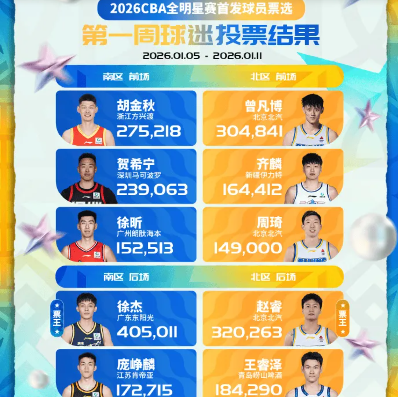 2026CBA全明星赛,首周投票具体情况如下: